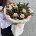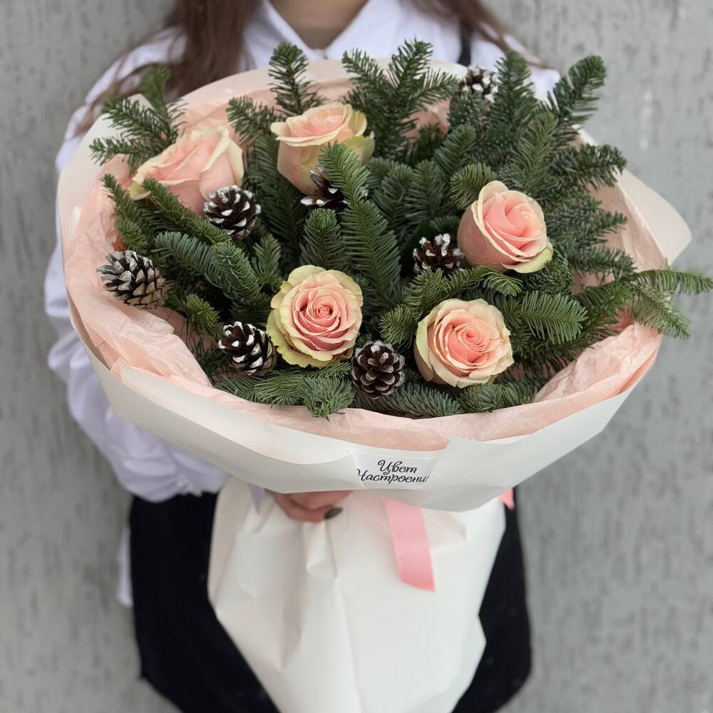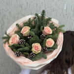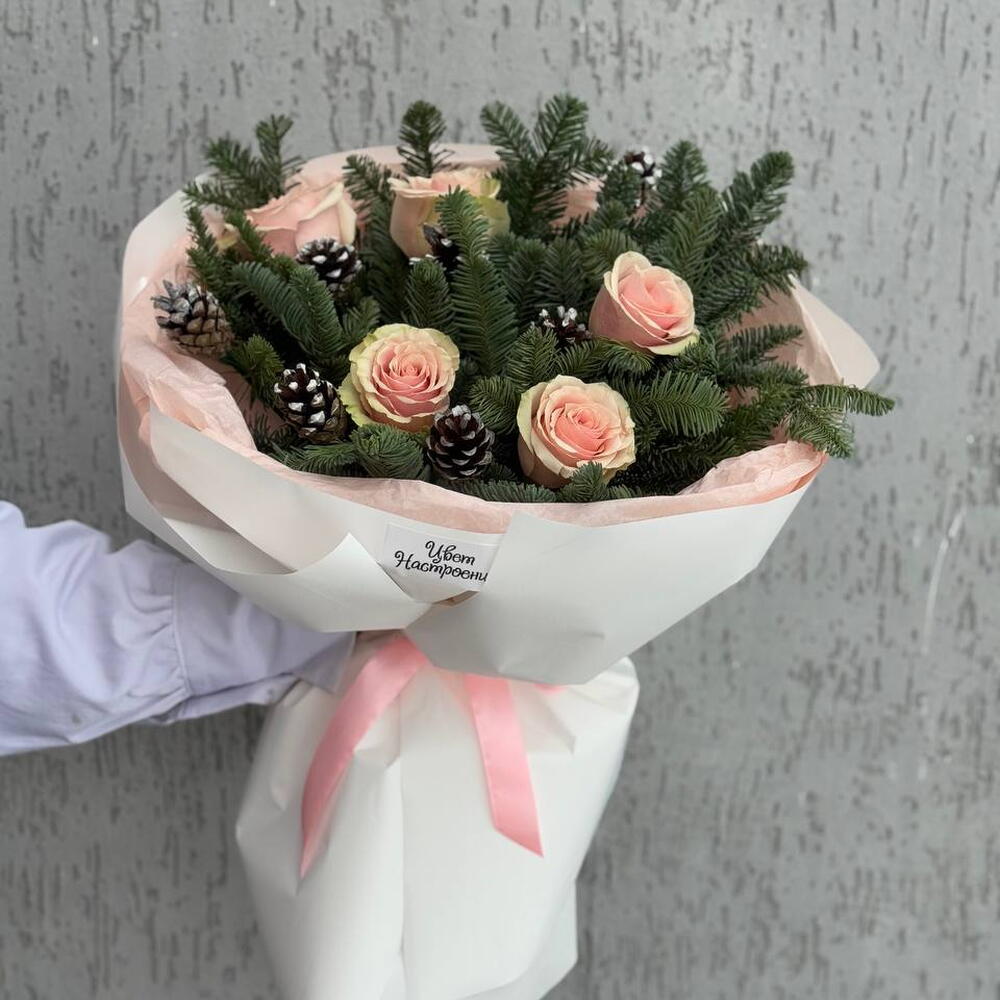 Роза Эквадор - 5 шт. Лента атласная - 1 шт. Тишью - 1 шт. Пленка - 2 шт. Нобилис - 2 шт. декоративные шишки - 3 шт.