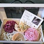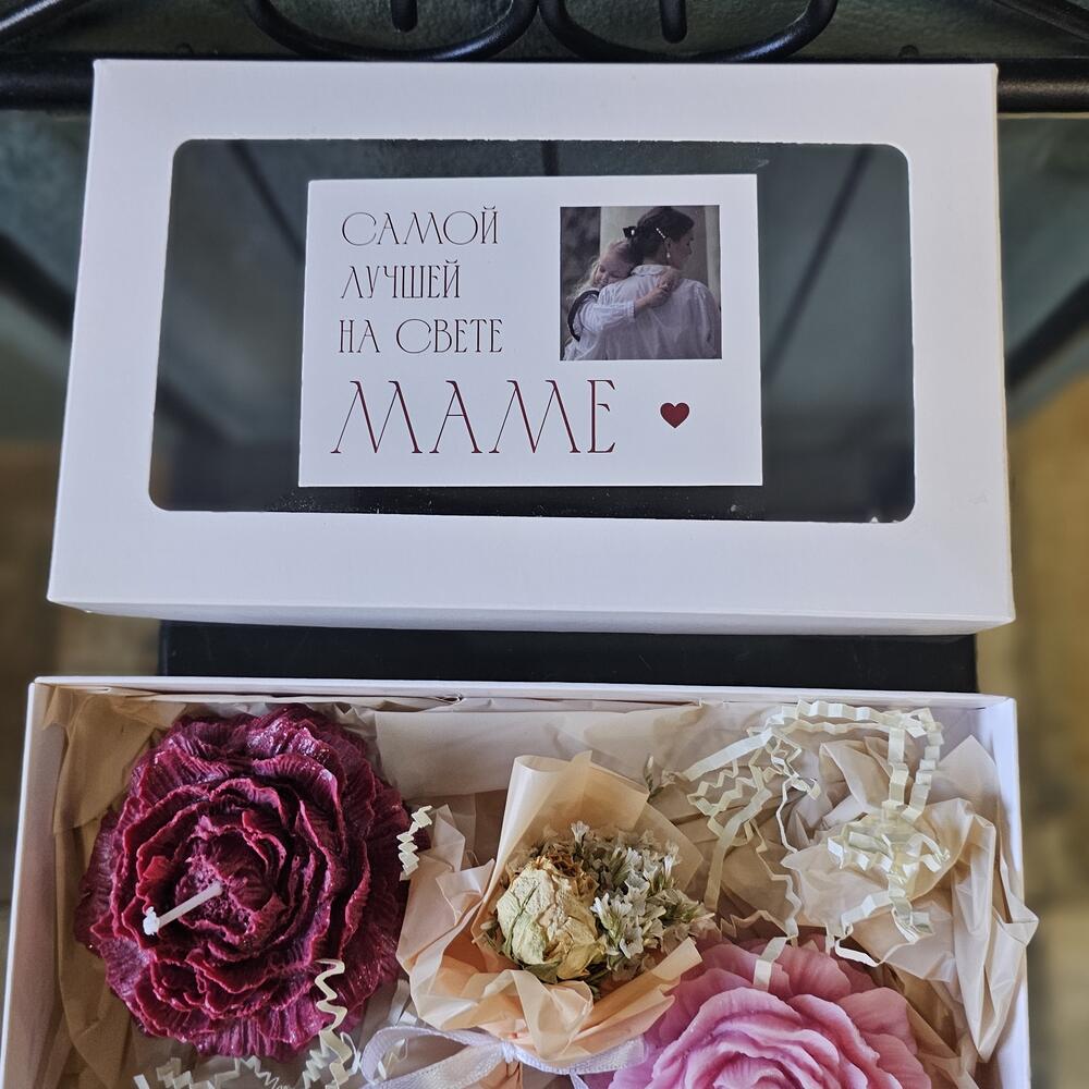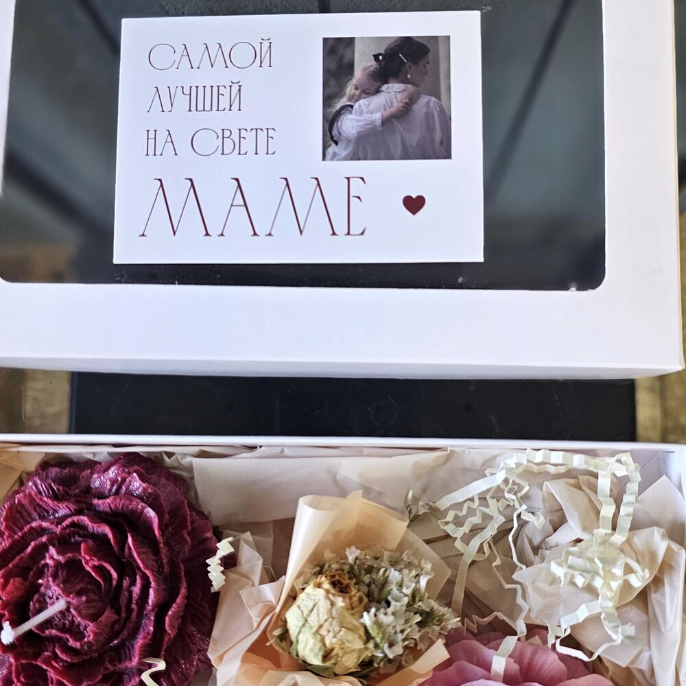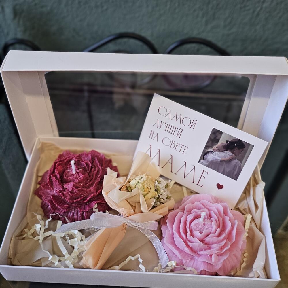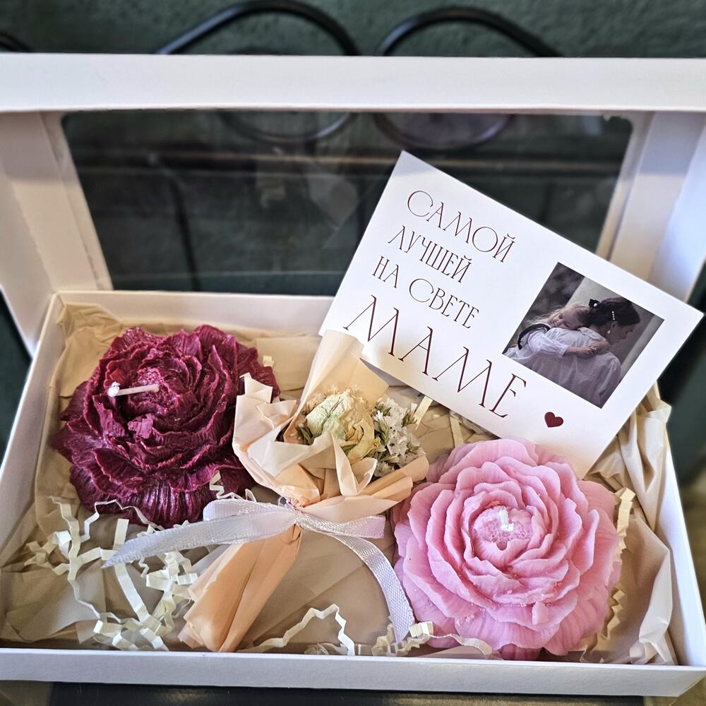 В составе набора 2 свечи с ароматом пиона и нероли. У паковать в подарочную коробку с открыткой и мини букетиком из сухоцветов для мамы .
