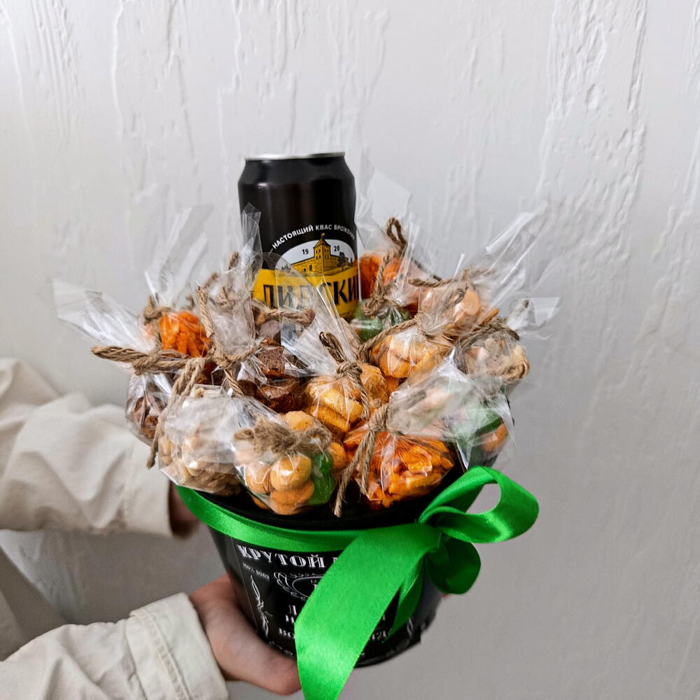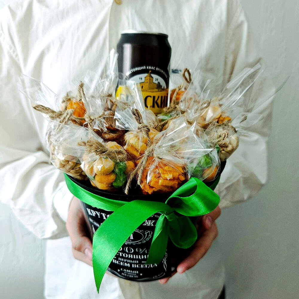 кашпо пластиковое - 1 шт. арахис васаби в глазури - 3 шт. арахис соленый - 3 шт. кириешки кулек - 3 шт. соломка картофельная - 3 шт. бобы соленые - 3 шт. хрустим багет кулек - 3 шт. лидский квас безалкогольный - 1 шт.