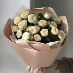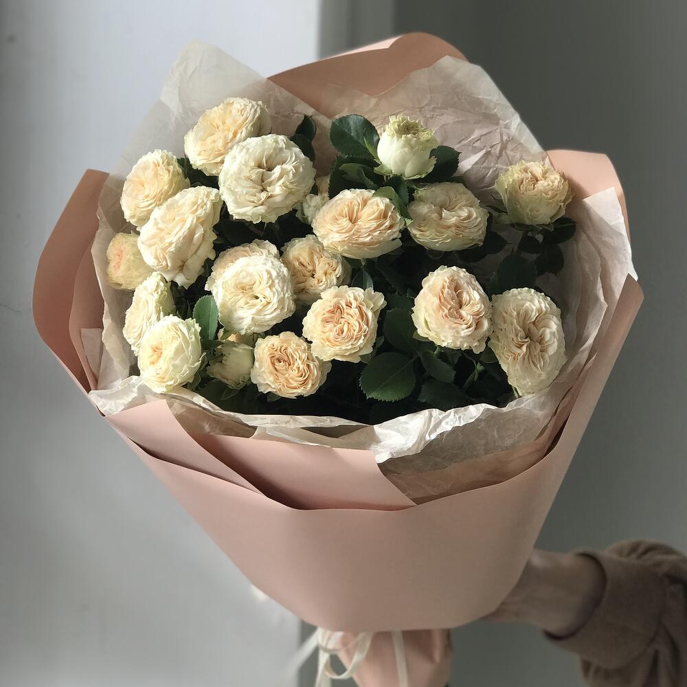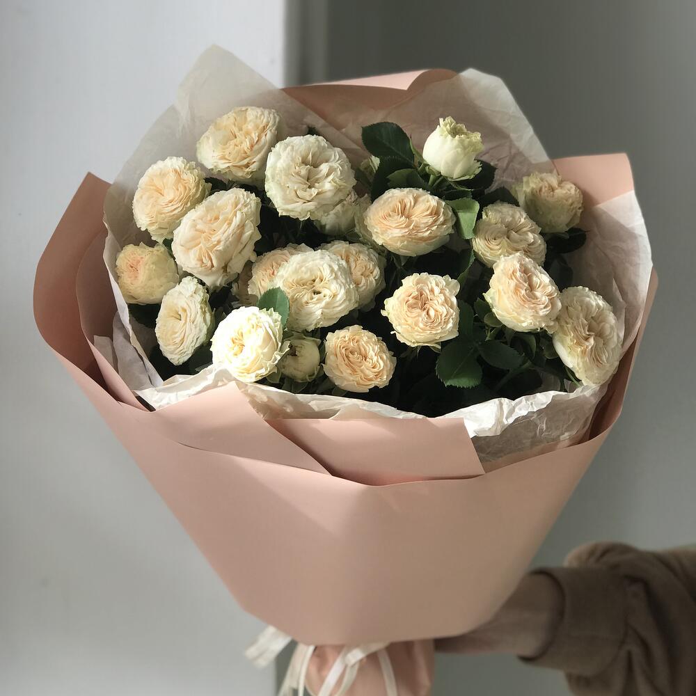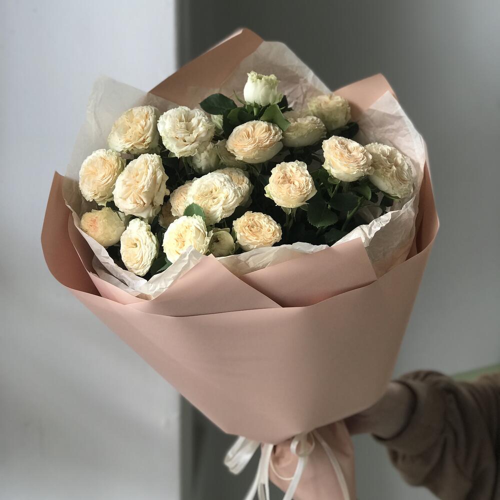 Открыточка с вашими пожеланиями - 1 шт. Дизайнерская упаковка - 1 шт. кустовые пионовидные розы - 5 шт.