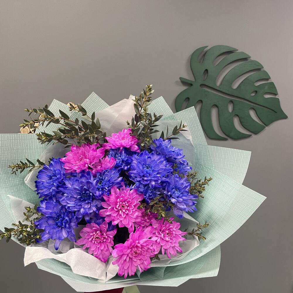 Букет из 5 крашеных хризантем с зеленью