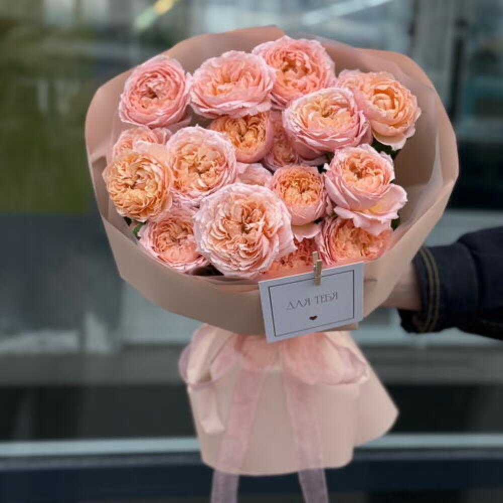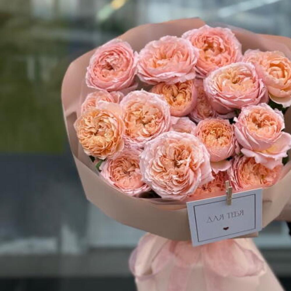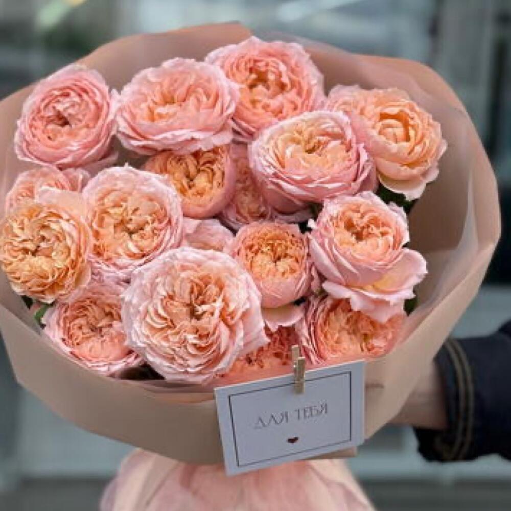 Лента атласная - 2 шт. Упаковка дизайнерская - 6 шт. джульетта кустовая роза пионовидная - 5 шт.