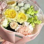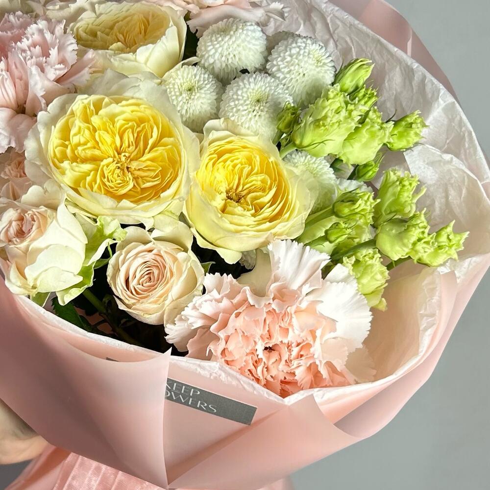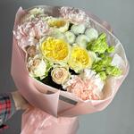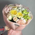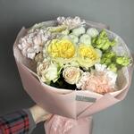 Кустовая роза - 2 шт. Эустома - 1 шт. Тишью - 2 шт. Диантус - 3 шт. Кустовая пионовидная роза - 1 шт. Пленка матовая - 4 шт. ньютон хризантема - 1 шт.