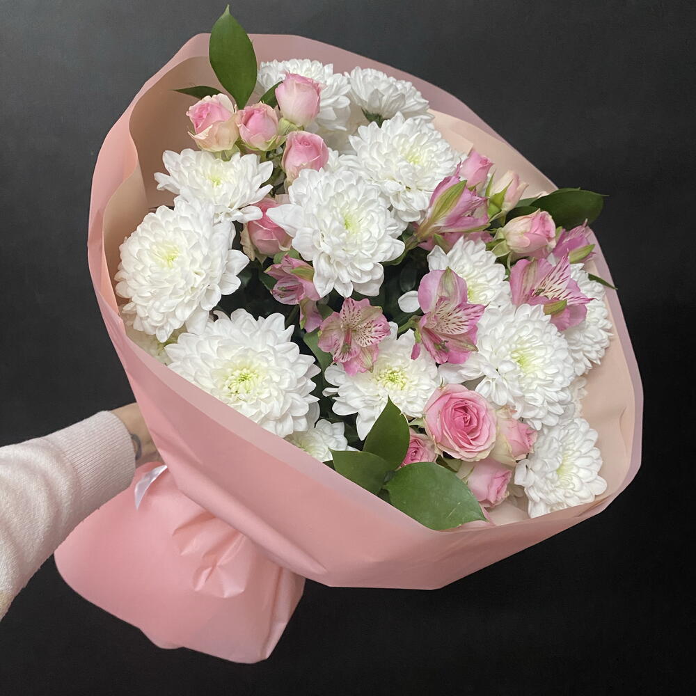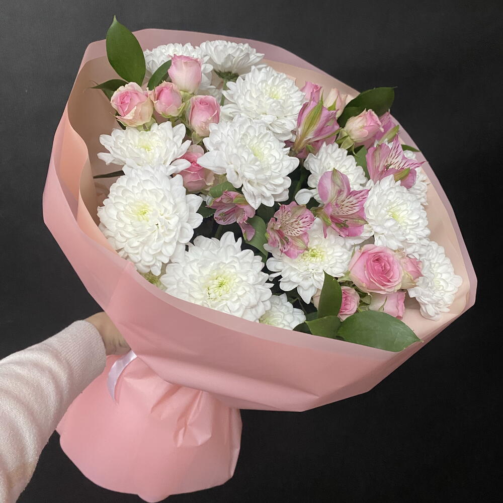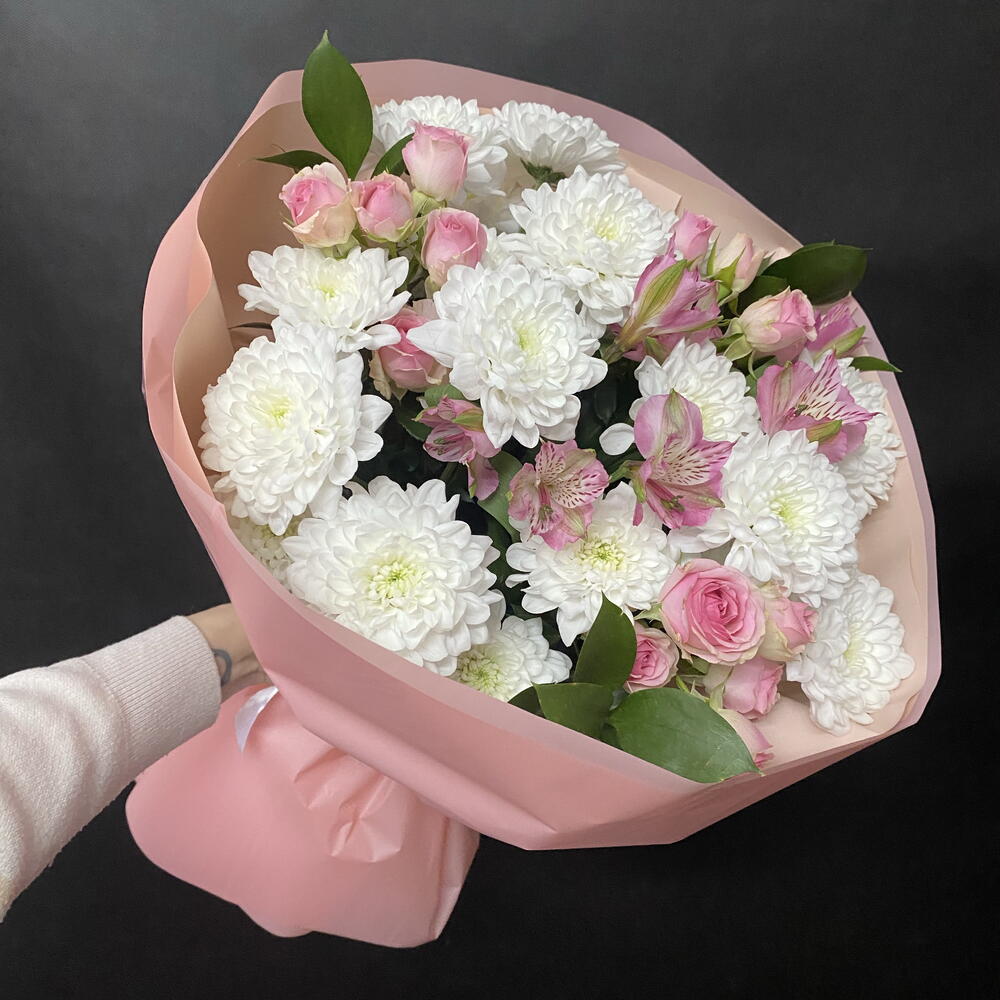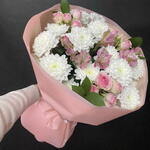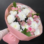 Альстромерия - 2 шт. Рускус - 3 шт. Кустовая роза розовая - 3 шт. Упаковка дизайнерская - 2 шт. бант атласный - 1 шт. Хризантема кустовая Алтай - 3 шт.