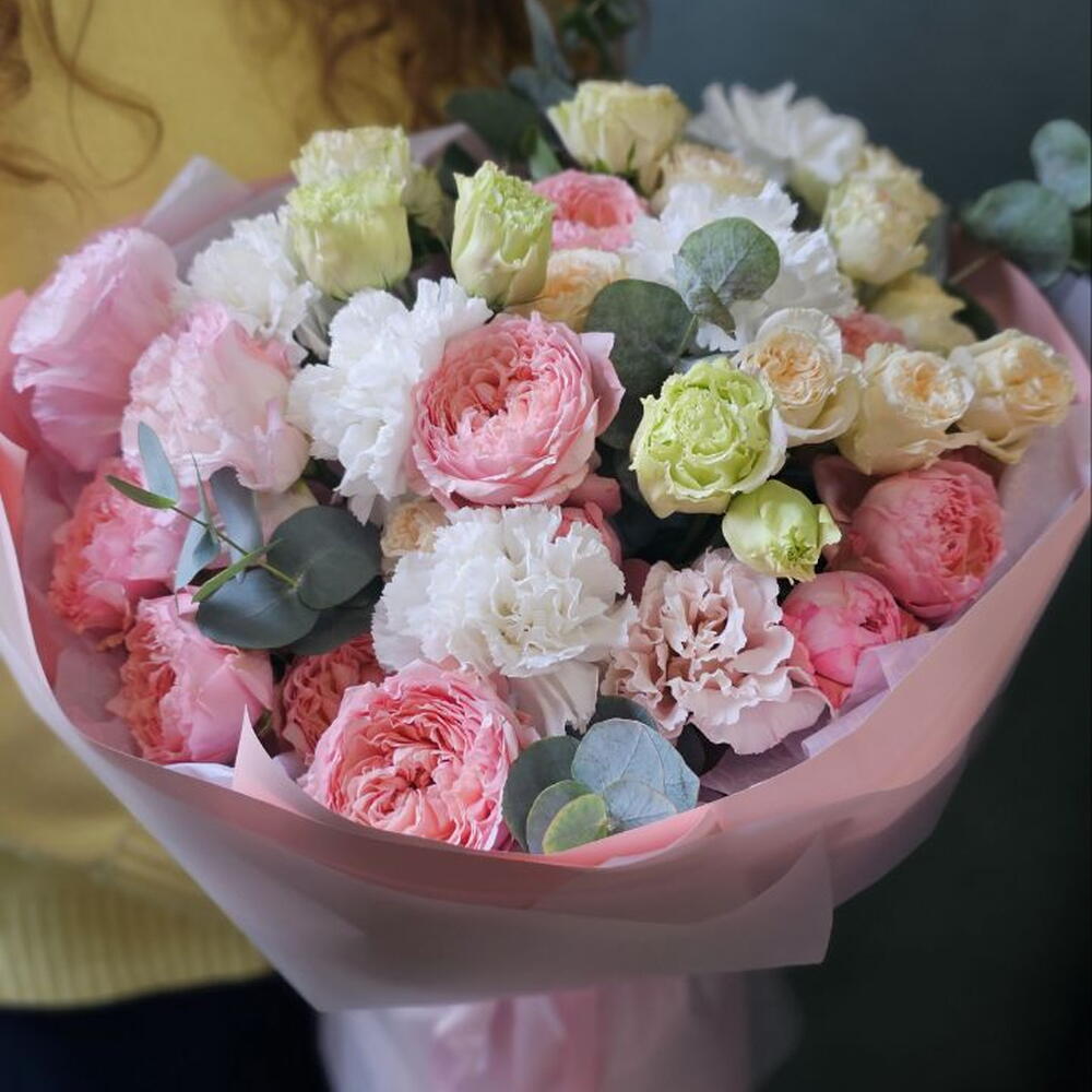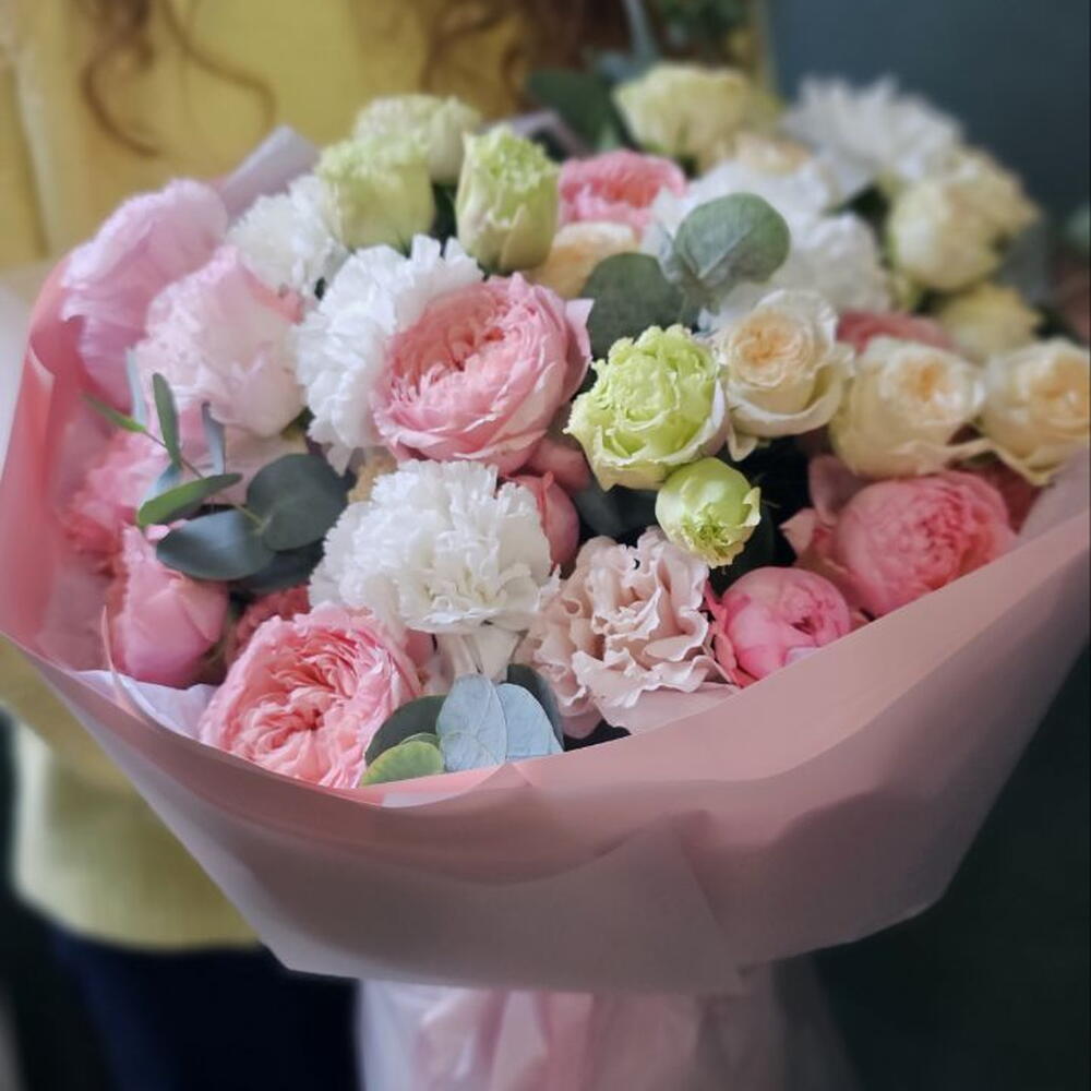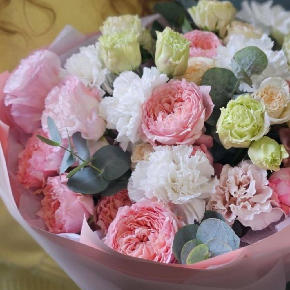 Эустома - 3 шт. Диантус - 5 шт. Роза кустовая пионовидная - 5 шт. Эвкалипт Микс - 2 шт.