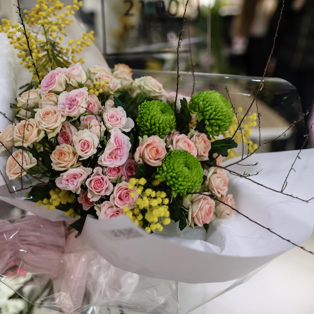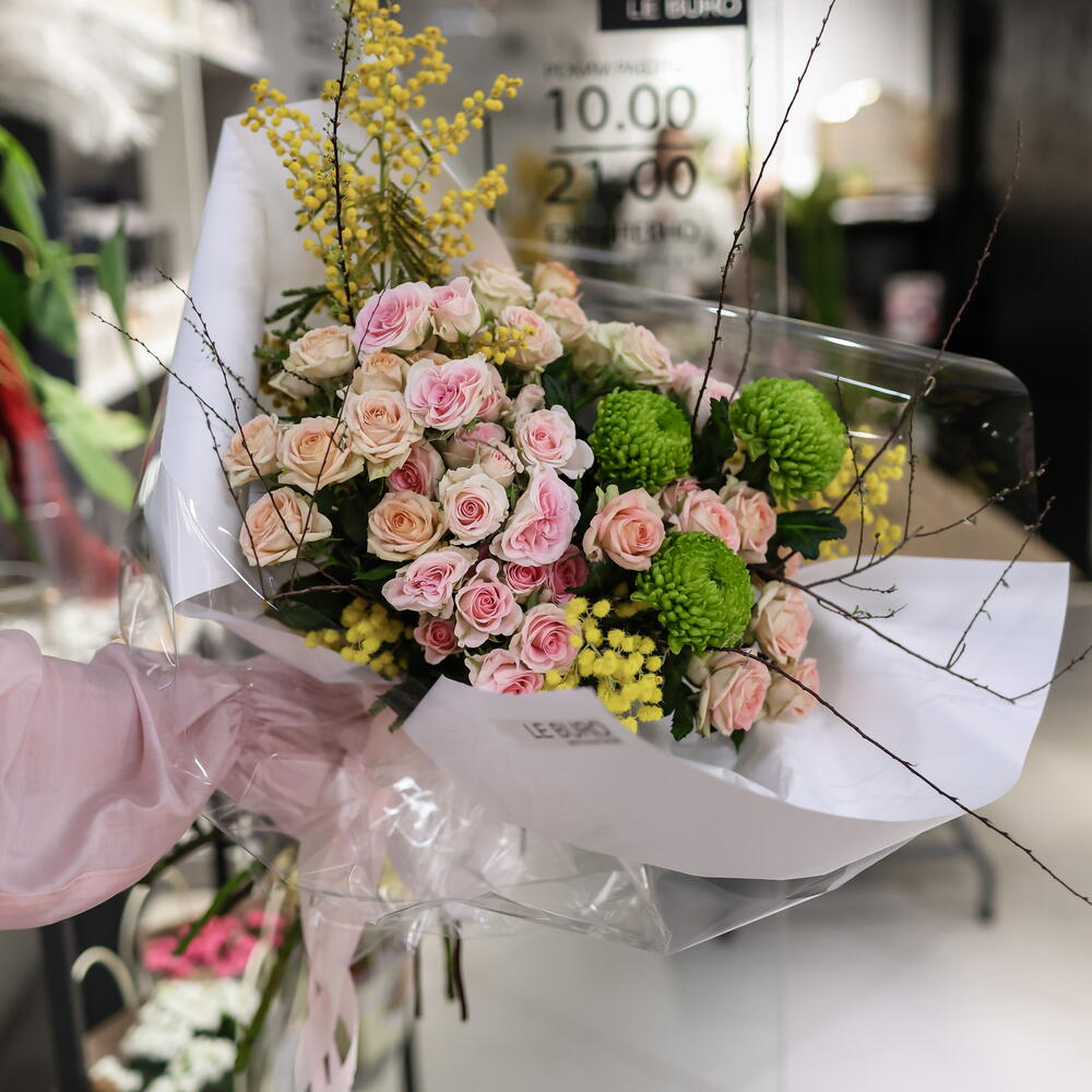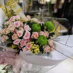Кустовая роза - 2 шт. Хризантема одноголовая - 3 шт. Ветки - 3 шт. Кустовая роза пионовидная - 3 шт. мимоза абхазия - 3 шт.