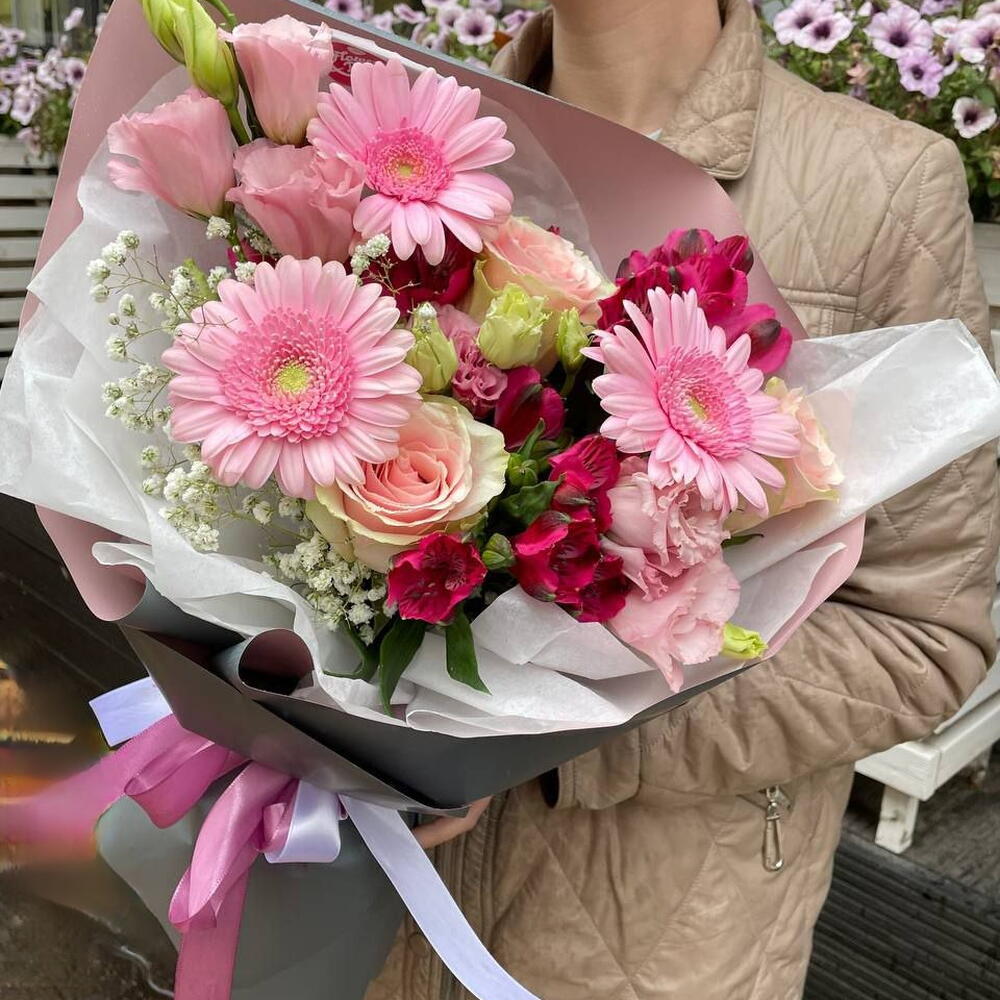 Альстромерия - 2 шт. Гипсофила - 1 шт. Роза Эквадор - 3 шт. Эустома - 1 шт. Гербера - 3 шт. Упаковка дизайнерская - 1 шт.