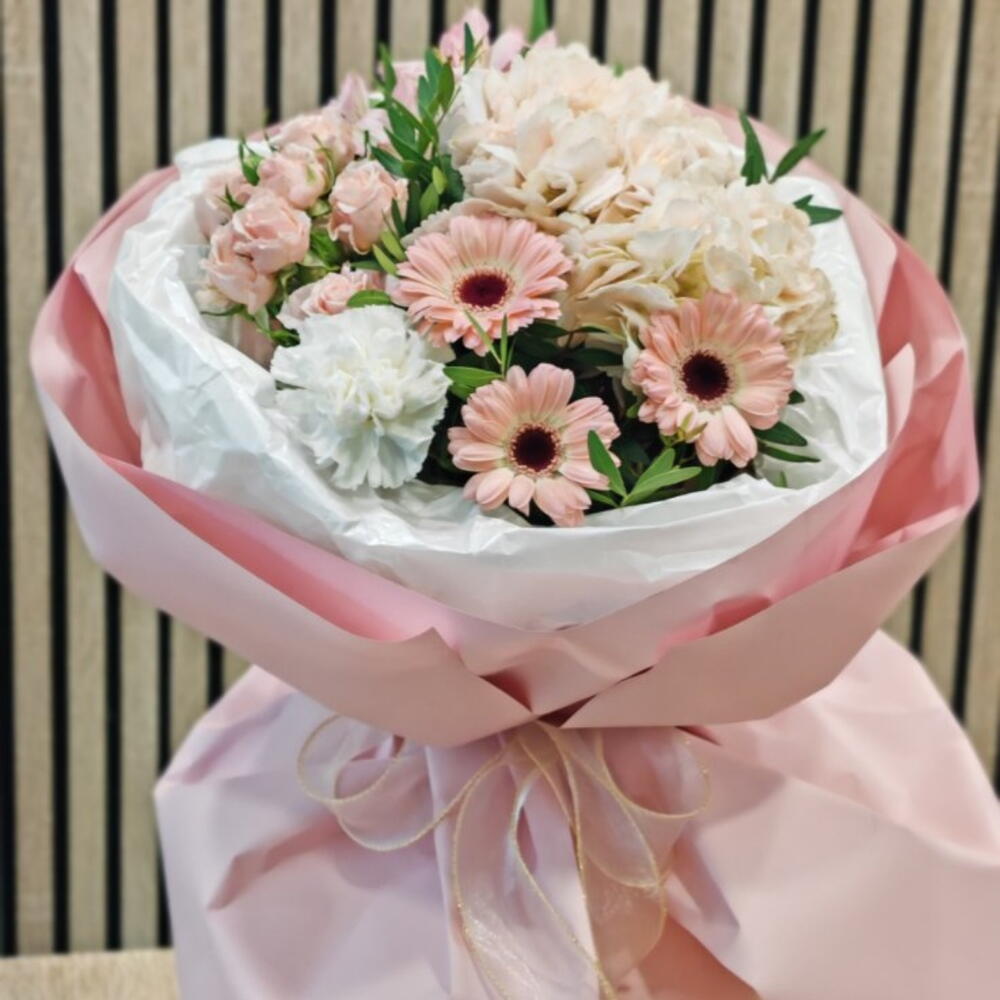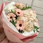 Альстромерия - 1 шт. Гортензия - 1 шт. Писташ - 3 шт. Роза кустовая - 1 шт. Упаковка - 2 шт. Лента атласная - 1 шт. Гербера - 3 шт. Диантус - 1 шт.