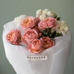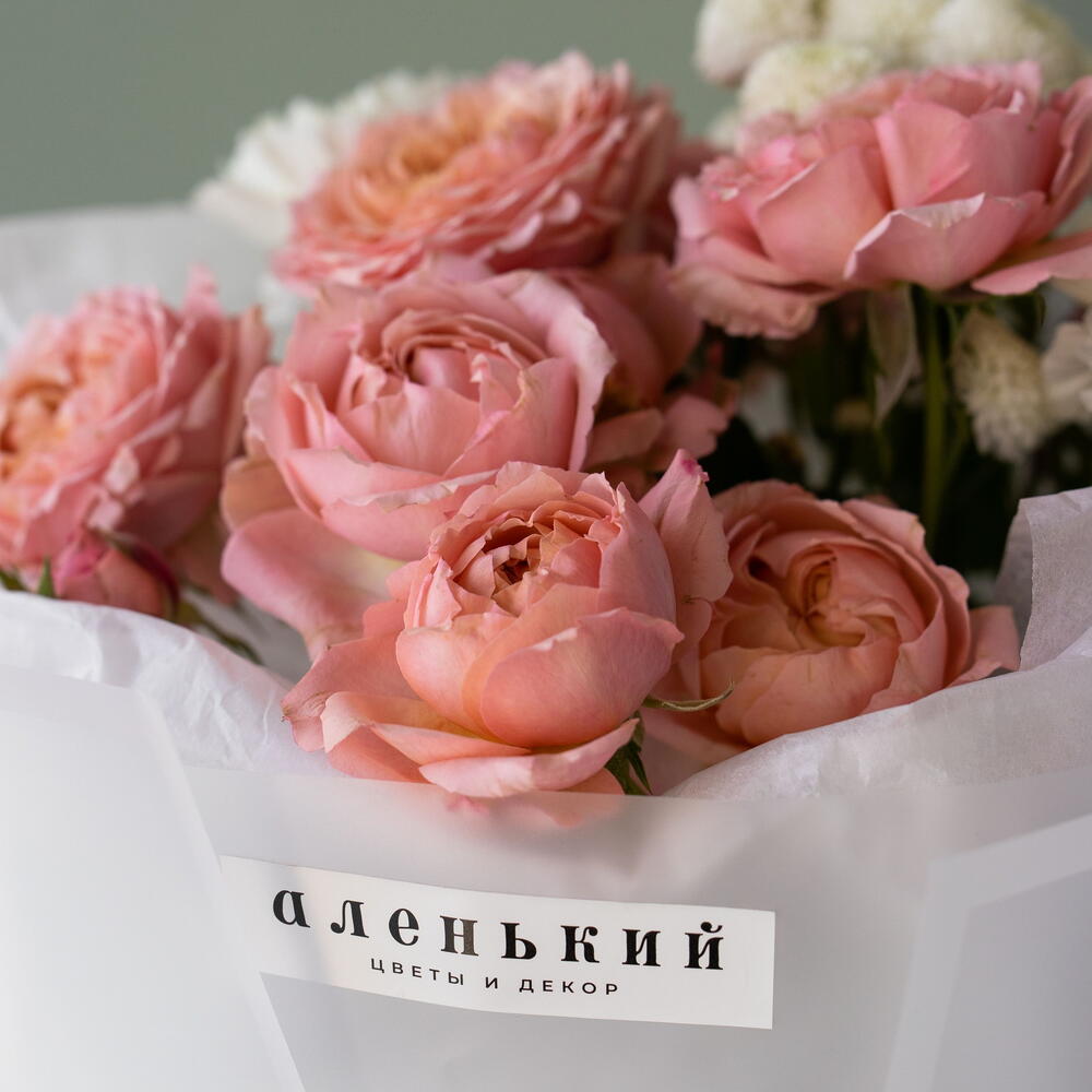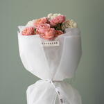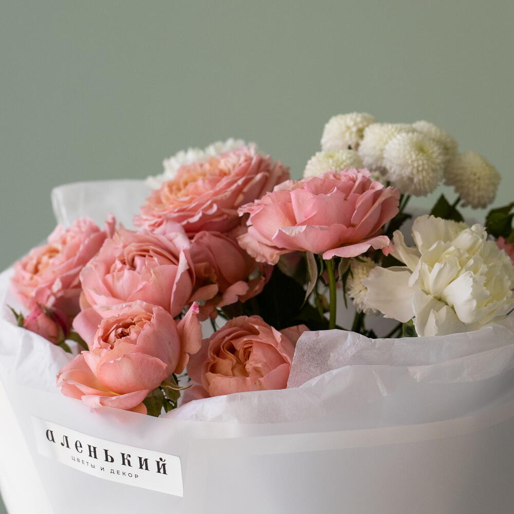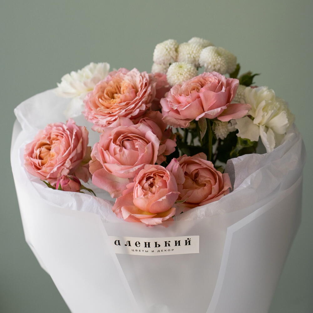 Гвоздика - 2 шт. Лента атласная - 1 шт. Тишью - 2 шт. Упаковка дизайнерская - 4 шт. джульетта кустовая роза пионовидная - 2 шт. ньютон хризантема - 1 шт.