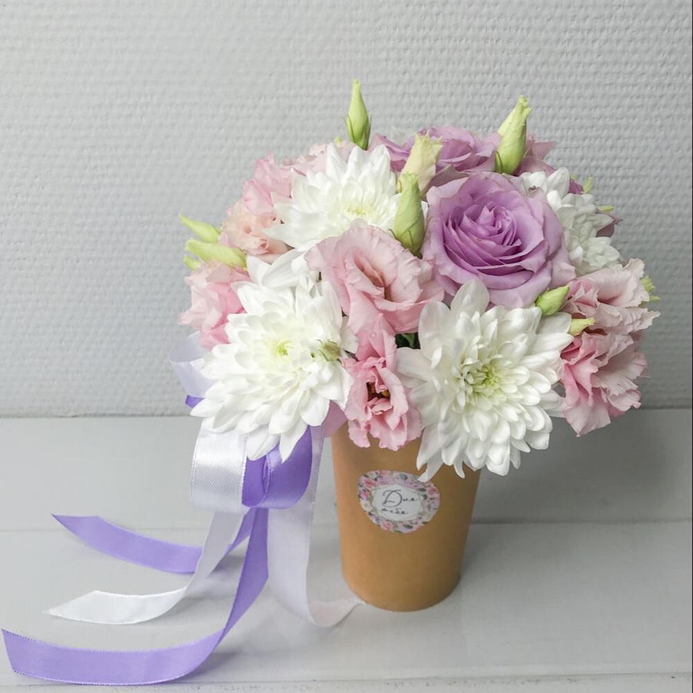 Хризантема кустовая - 1 шт. Роза - 1 шт. бант атласный - 1 шт. кофейный стакан - 1 шт.