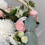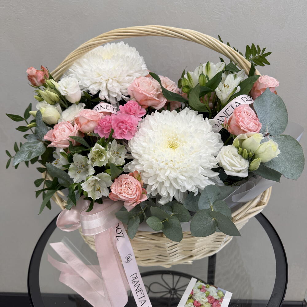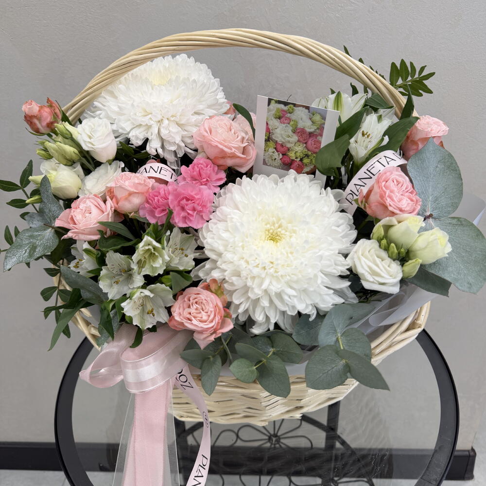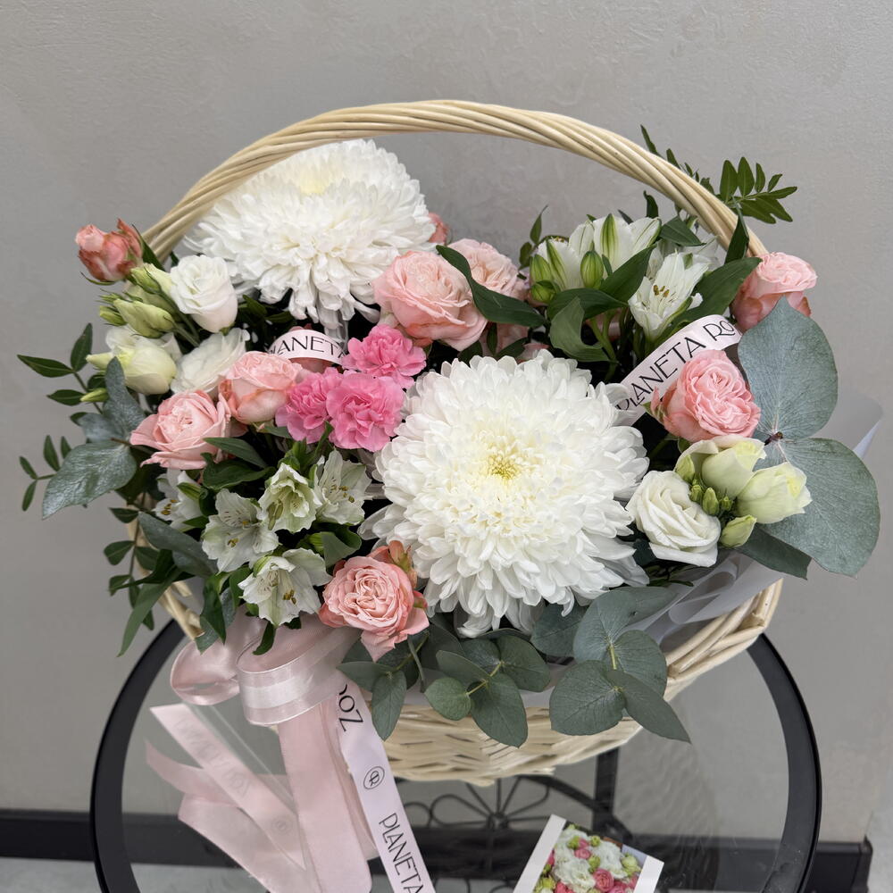 Альстромерия - 3 шт. Эустома - 1 шт. Корзина плетеная - 1 шт. Диантус кустовой - 1 шт. Эвкалипт Микс - 5 шт. Оазис флористический - 5 шт. Одноголовая хризантема - 2 шт. ленты атласные - 3 шт. ветвистая роза - 3 шт.