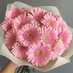 Лента атласная - 1 шт. Гербера - 15 шт. Упаковка дизайнерская - 2 шт.
