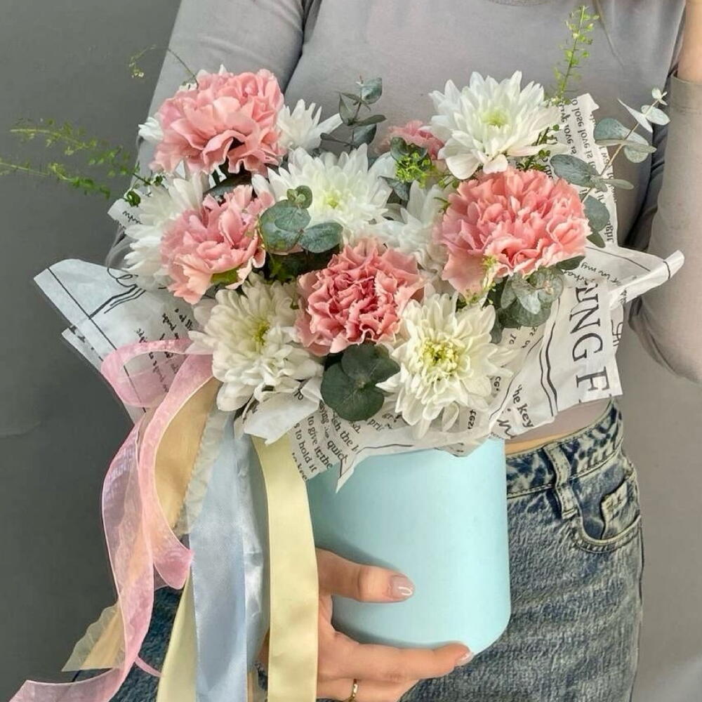 Тласпи - 1 шт. Хризантема кустовая - 2 шт. Диантус - 5 шт. Коробка шляпная - 1 шт. Эвкалипт Микс - 1 шт. бант атласный - 3 шт.