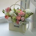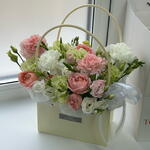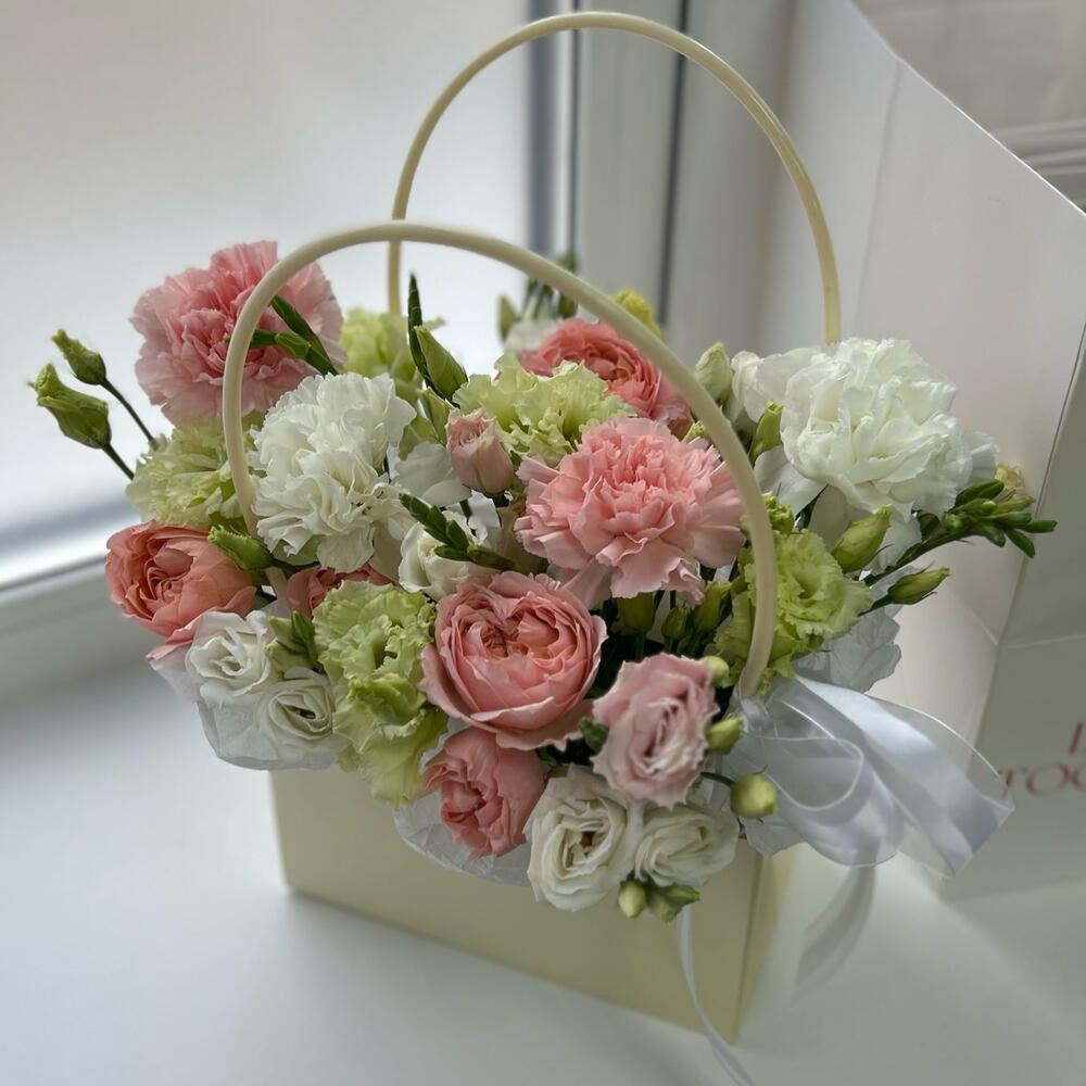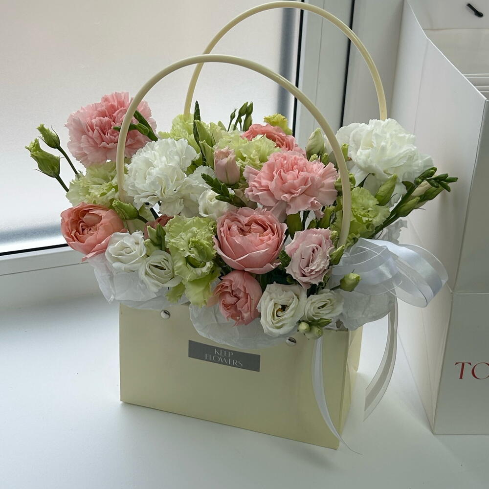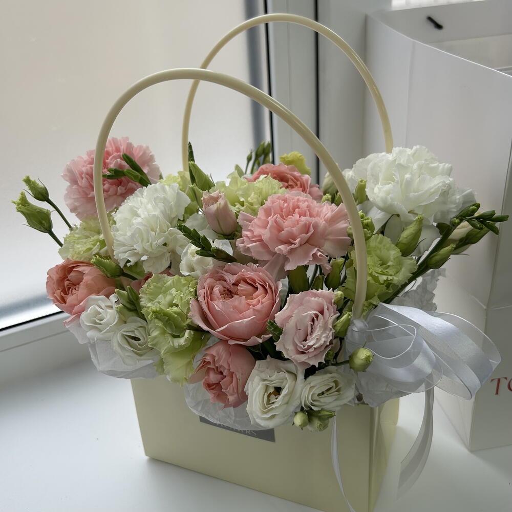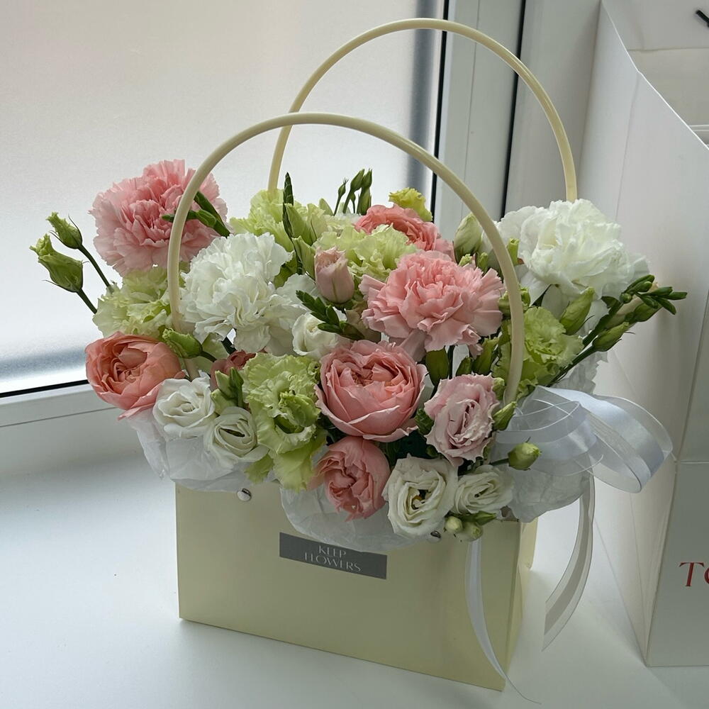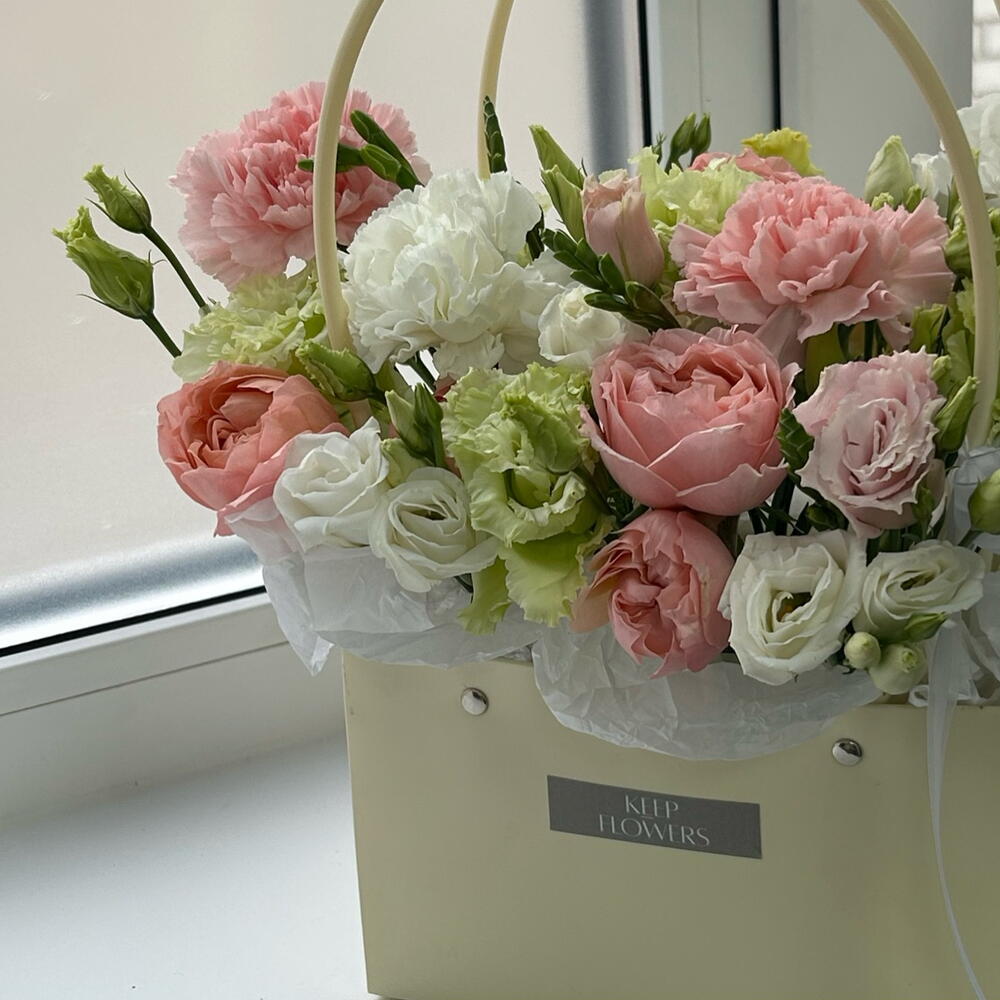 Эустома - 4 шт. Диантус - 4 шт. Сумочка - 1 шт. Лента органза - 1 шт. Фрезия Микс - 1 шт. джульетта роза пионовидная - 1 шт. Губка флористическая - 1 шт.
