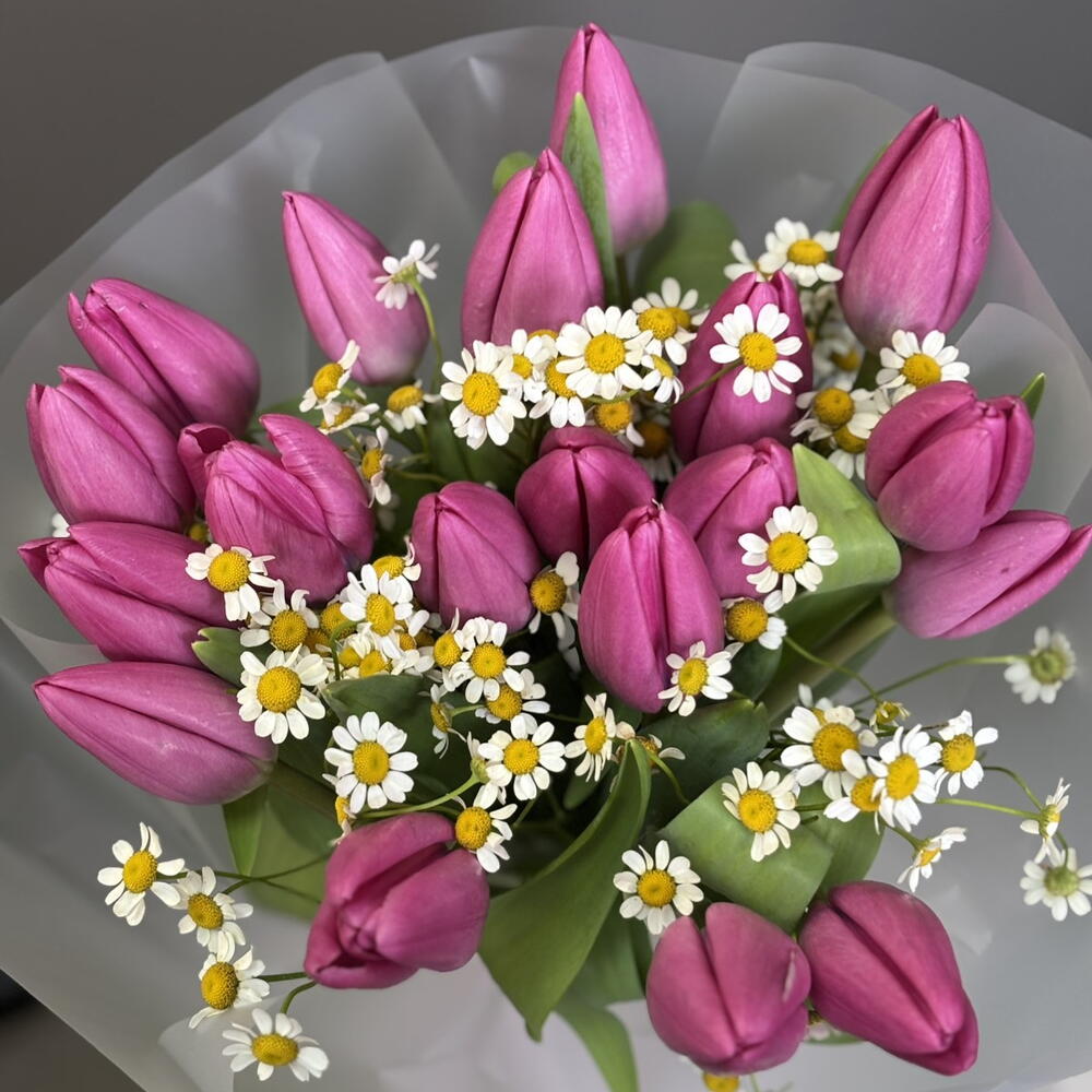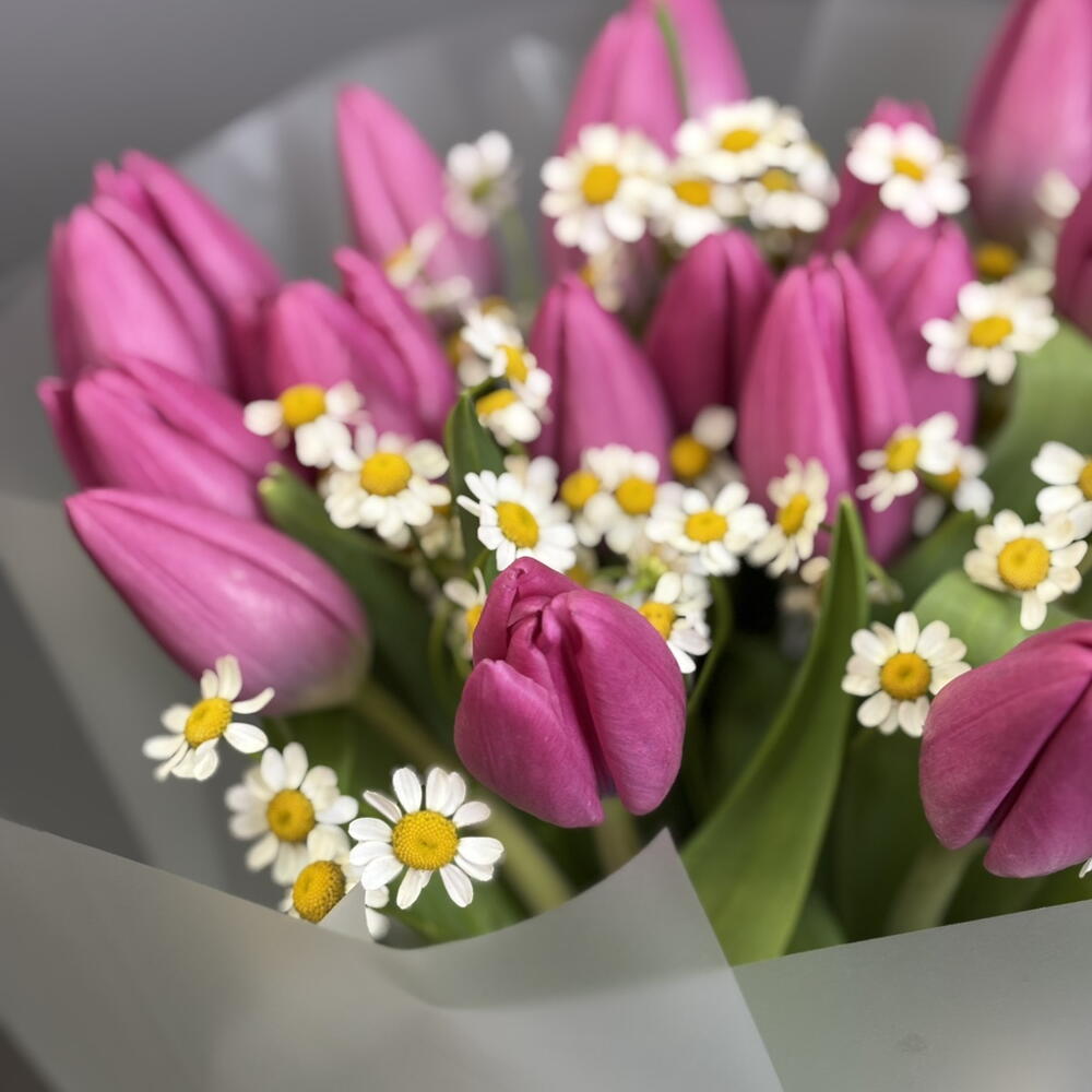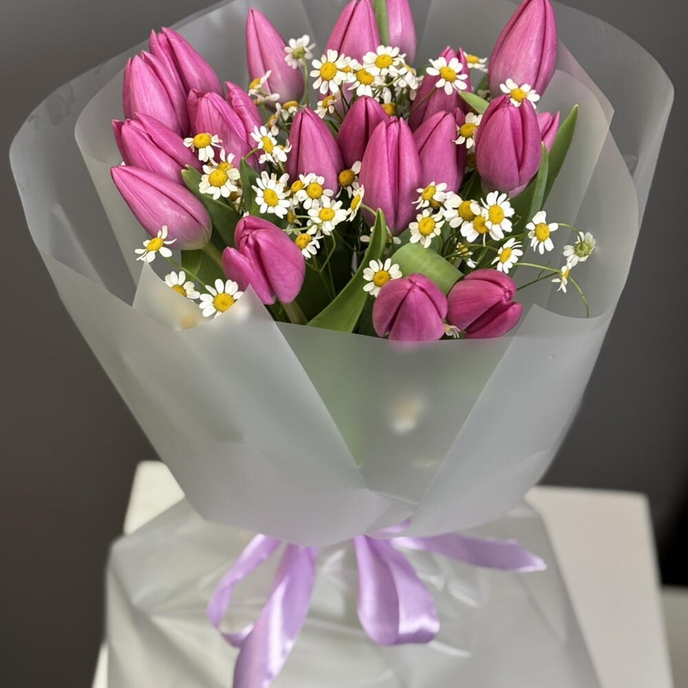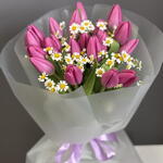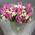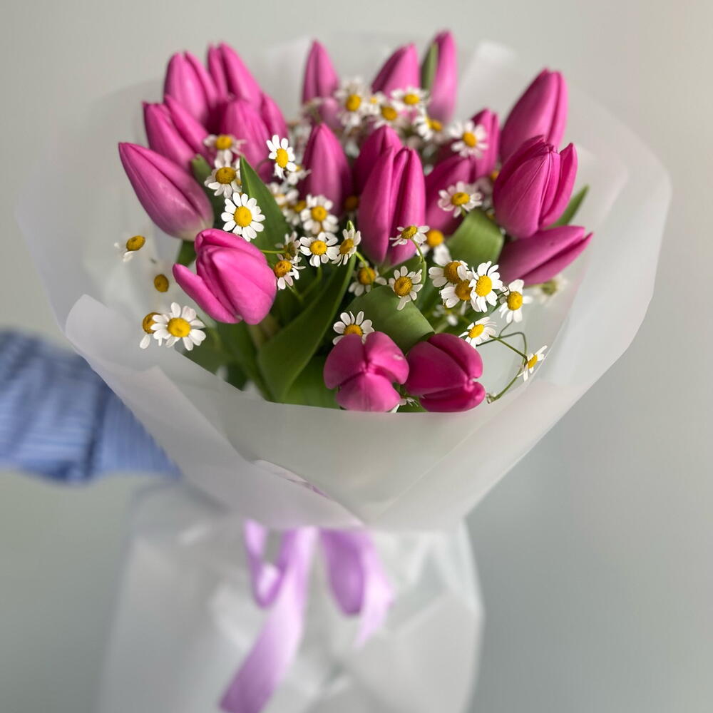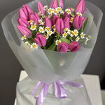 Танацетум - 3 шт. Тюльпан розовый - 19 шт. Упаковка дизайнерская - 4 шт. Открыточка с вашими пожеланиями - 1 шт.