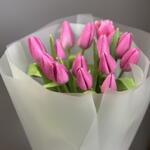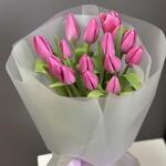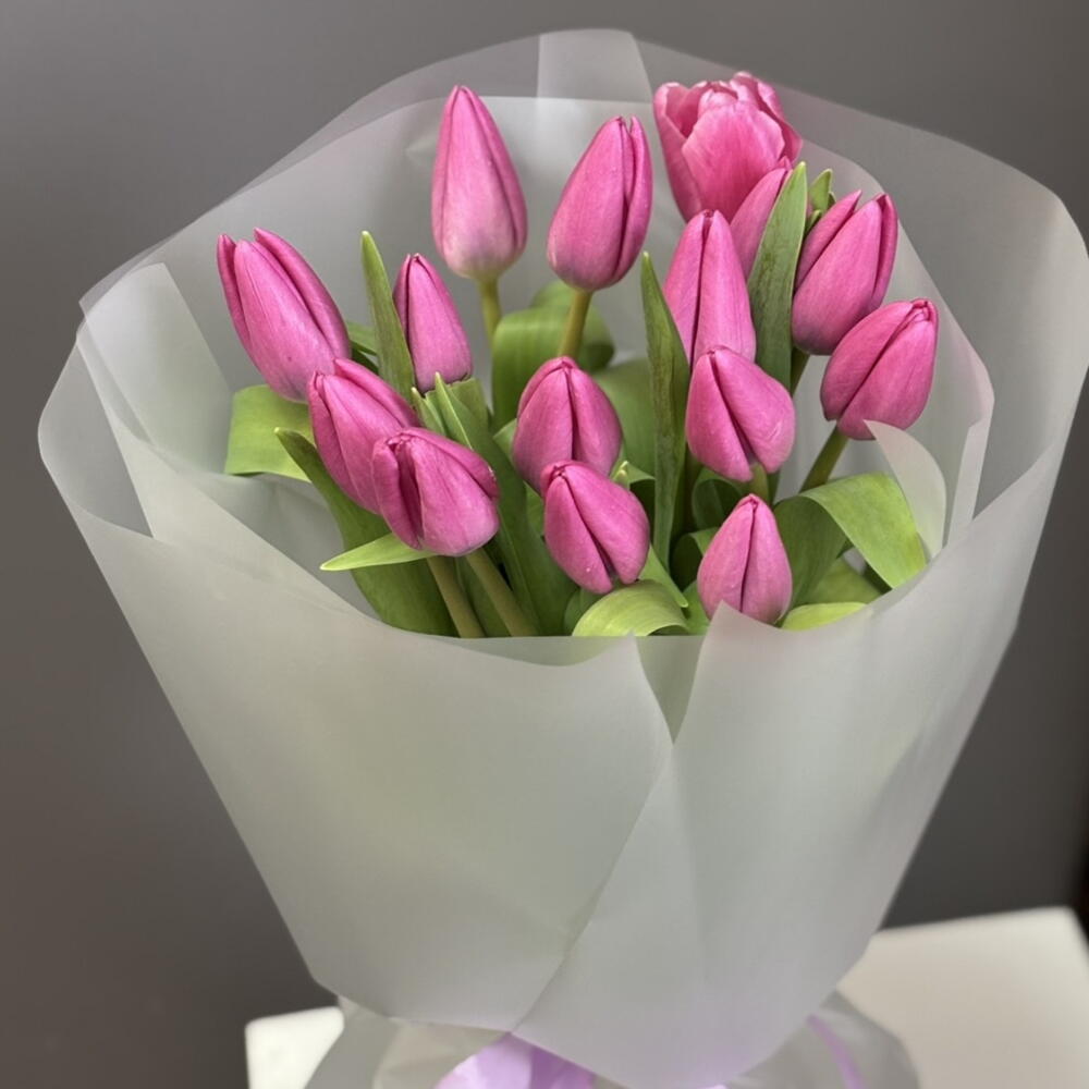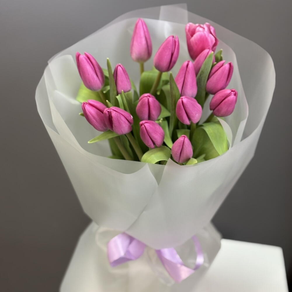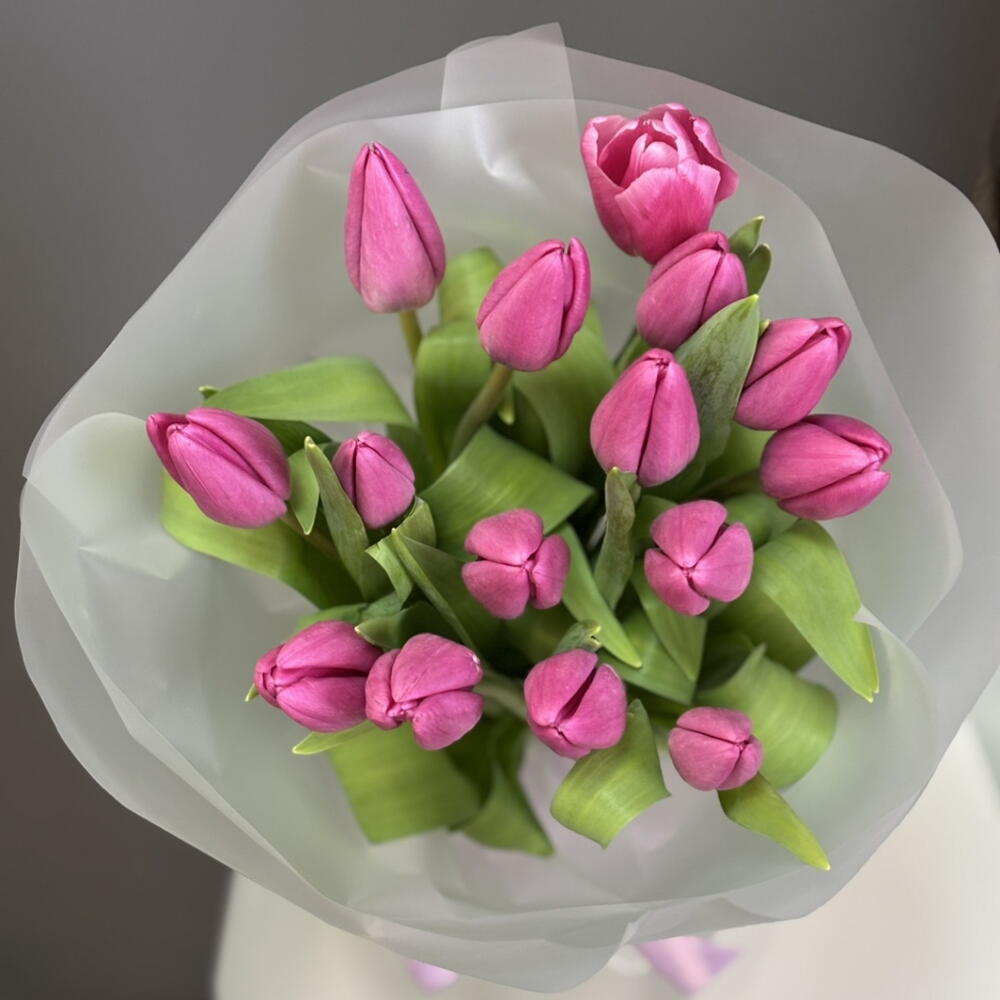 Упаковка дизайнерская - 4 шт. Тюльпан сортовой - 15 шт. Открыточка с вашими пожеланиями - 1 шт.
